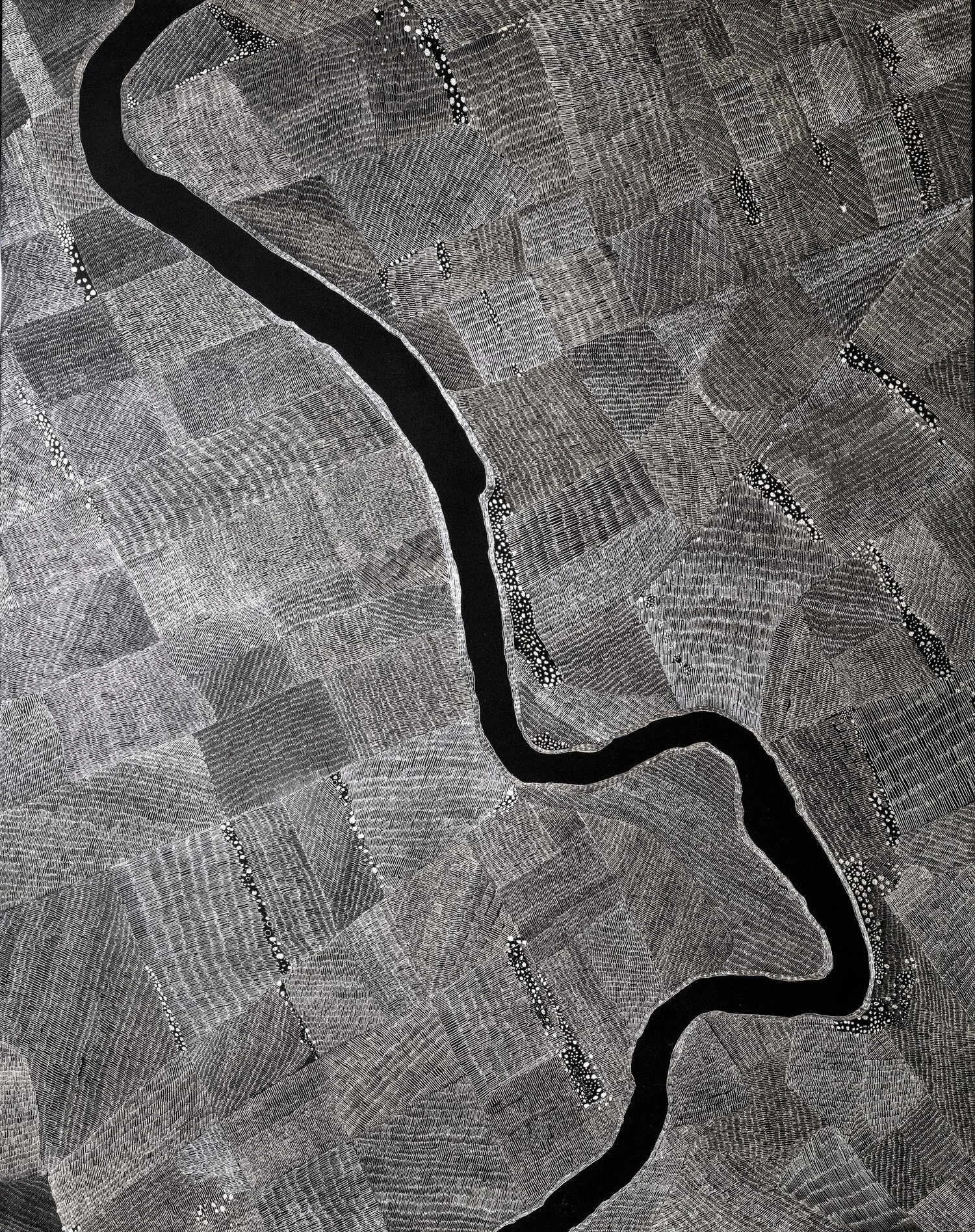 At least 90 per cent of New Zealand's wetlands have been destroyed, lost mainly through drainage and clearance for agriculture. When wetlands are destroyed, we also lose natural food sources, wildlife and harvesting practices. This artwork maps a small section of the Taiari Plain, south of Dunedin, once a resource-rich wetland environment, now drained the area is a patchwork of freehold farmland.